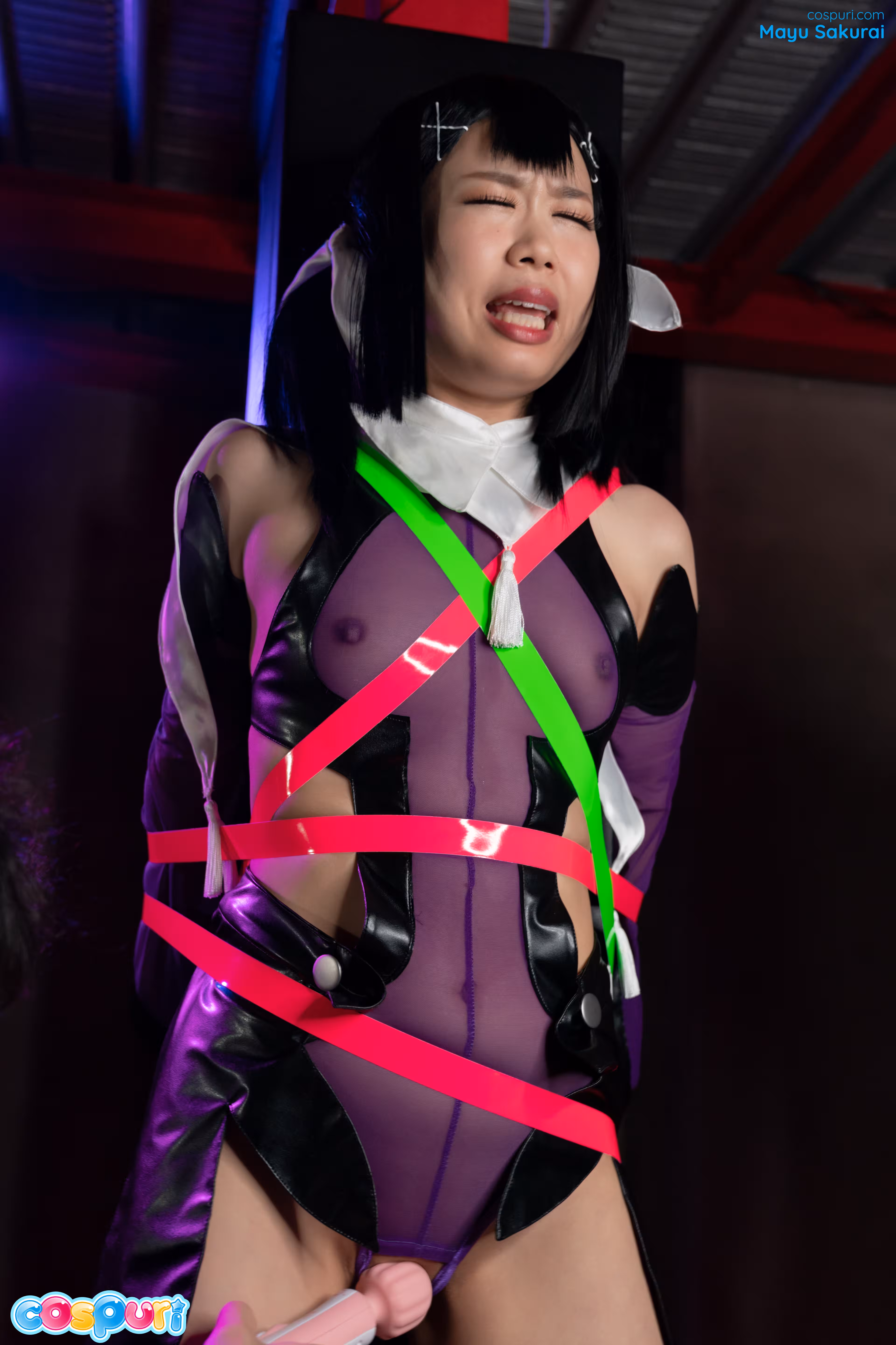 Cosplay 海洛因 Mayu Sakurai 被绑在一根柱子上,并被假阳具撞入两端。当她用假阳具作呕后,假阳具被塞进她的阴户,振动器将她的阴蒂压入多重高潮地狱。